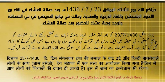 بإذن الله تعالى يوم الاثنين 22-7-1435 كلمة باللغه الاردية والهندية بمسجد الشيخ عبد العزيز حمد الحماد بحي الصحافة نفع الله بكم