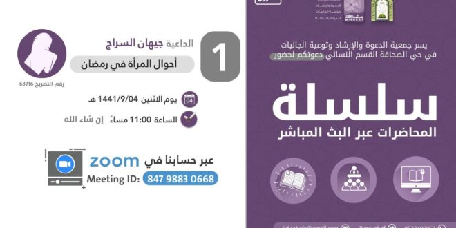 ?القسم النسائي? ضمن سلسلة المحاضرات عن بعد عبر البث المباشر ? أحوال المرأة في رمضان ? #رمضان_مبارك ? الداعية / جيهان السراج ?️الاثنين ٤ رمضان 1441 ه ⏱️الساعة 11:00 مساءً رابط القاعة/ https://us02web.zoom.us/j/84798830668 #كلنا_مسؤول