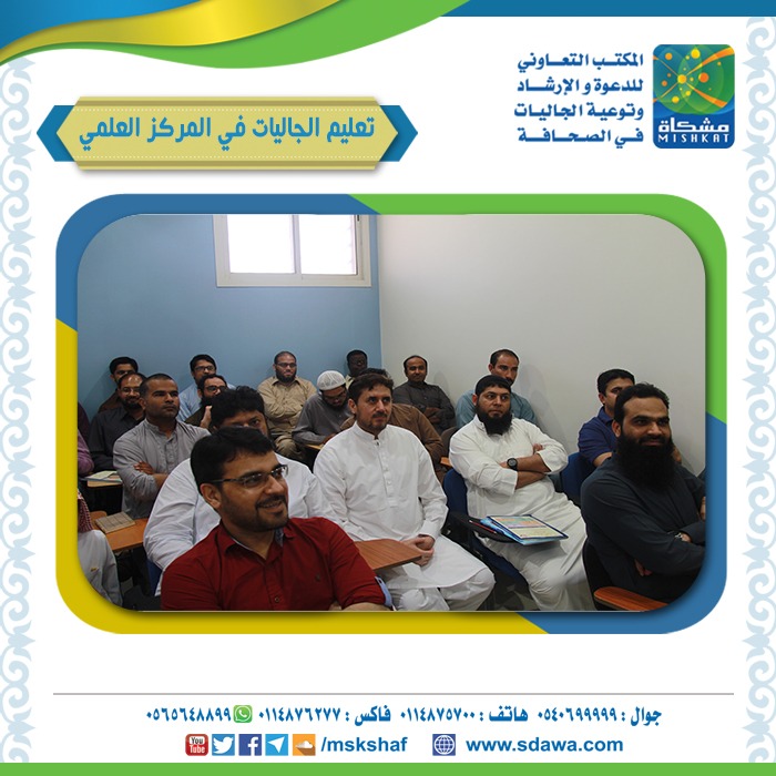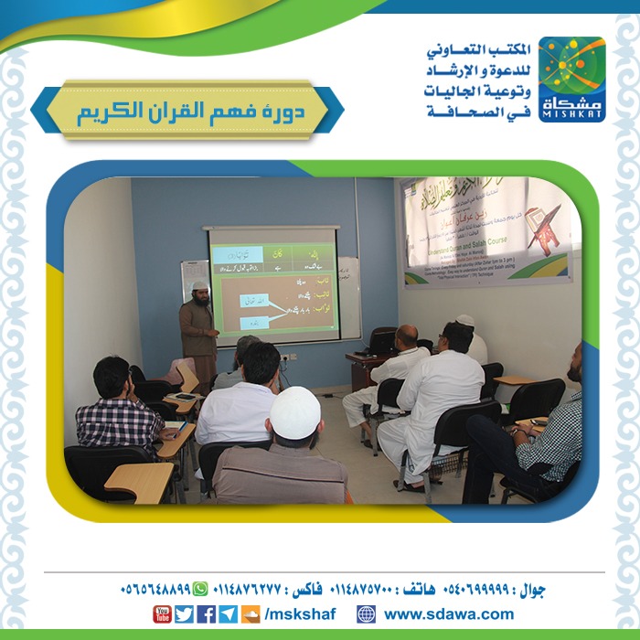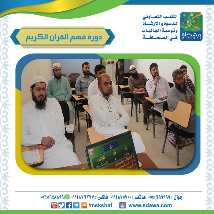 آقام مكتب الدعوة وتوعية الجاليات بالصحافة – مشكاة – في حي الصحافة بالرياض دورة تدريبية بعنوان فهم القرآن الكريم باللغة الأردية للجالية الباكستانية والهندية من مهندسين وموظفي شركات من الفئة المستفيدة من برامج المكتب وذلك يوم الأحد الماضي ١٢-٧-١٤٣٨هـ الموافق ٠٩-٠٤-٢٠١٧م والتي أقيمت في المركز العلمي بحي المروج التابع للمكتب.