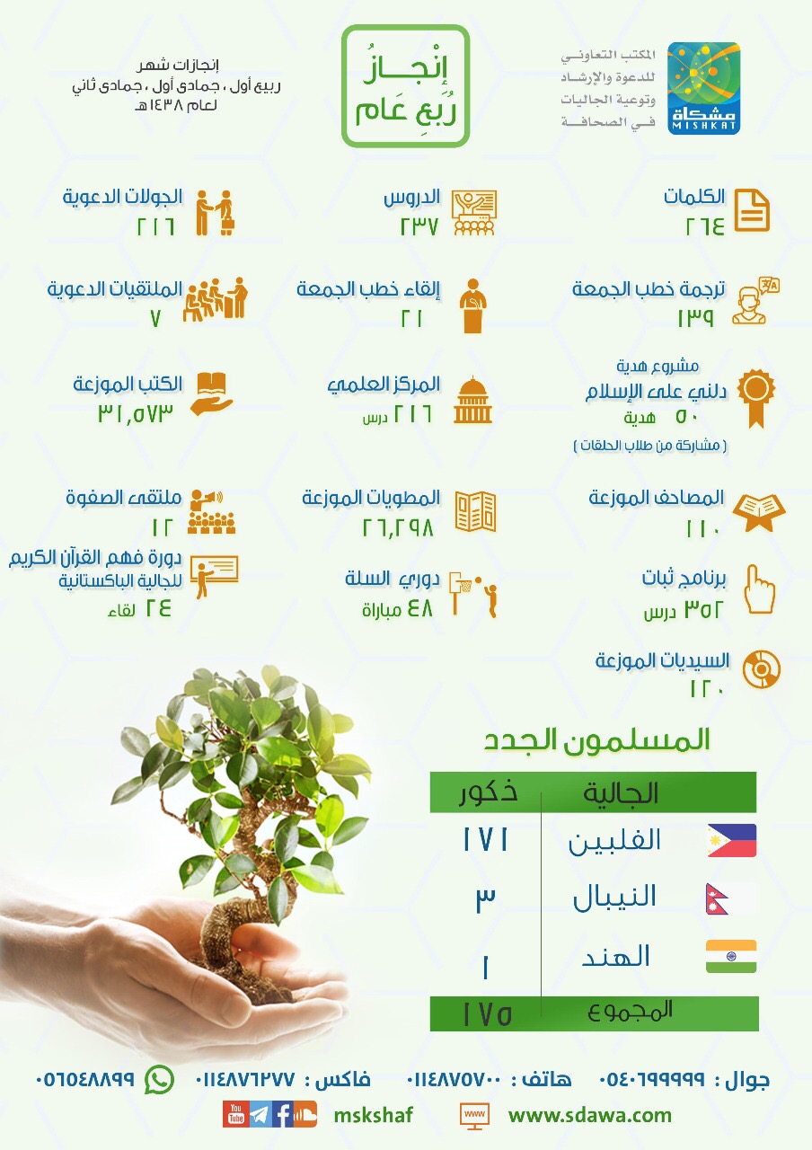 نزف لكم البشرى بـ إسلام ١٧٥ شخص من الجالية في مكتب الدعوة وتوعية الجاليات بالصحافة – مشكاة، وإلقاء أكثر من ٥٠١ درس وكلمة دعوية وذلك خلال الربع الثاني من العام الجاري 1438هـ ولله الحمد