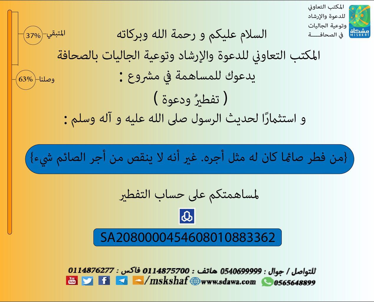 يدعوك المكتب التعاوني للدعوة والإرشاد وتوعية الجاليات بالصحاف، للمساهمة في مشروع(تفطيرٌ ودعوة).