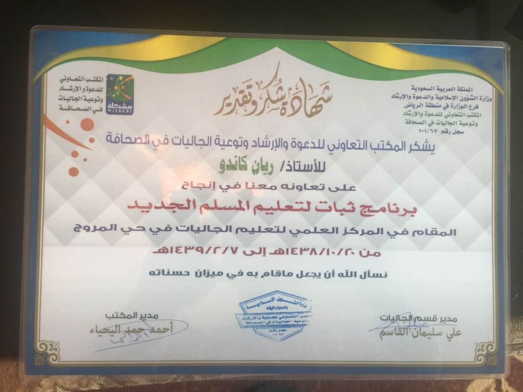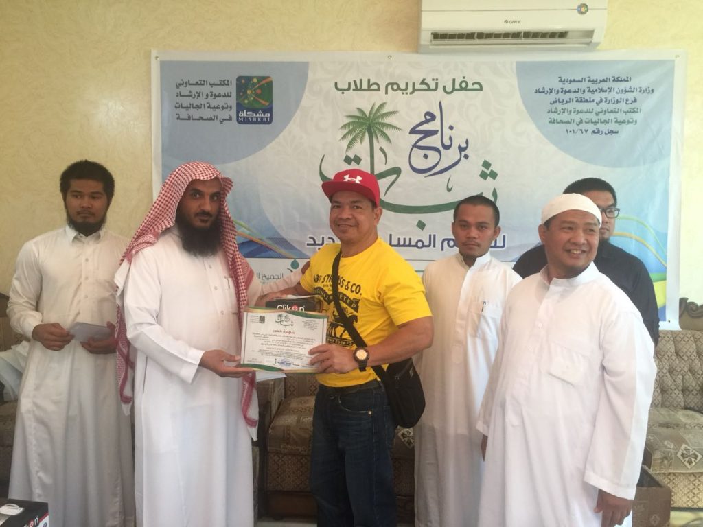 وكان ذلك في حفل تكريم طلاب برنامج ثبات لتعليم المسلم الجديد، وكرم المسلمين الجدد الشيخ علي القاسم المسؤول عن قسم توعية الجاليات .