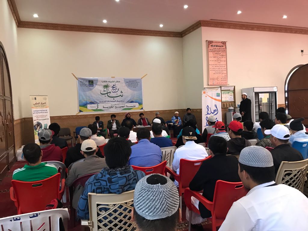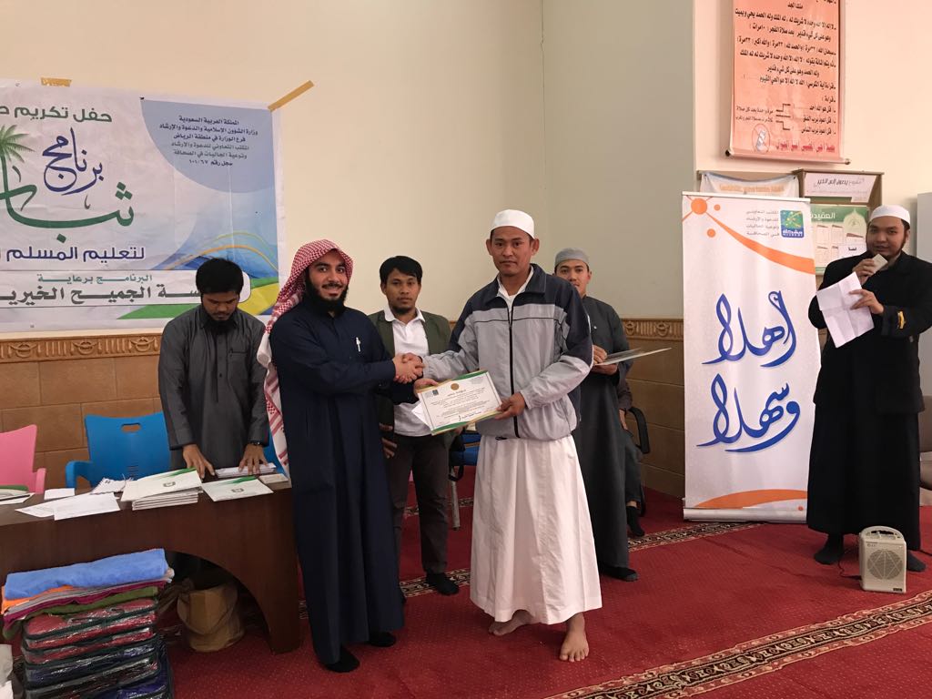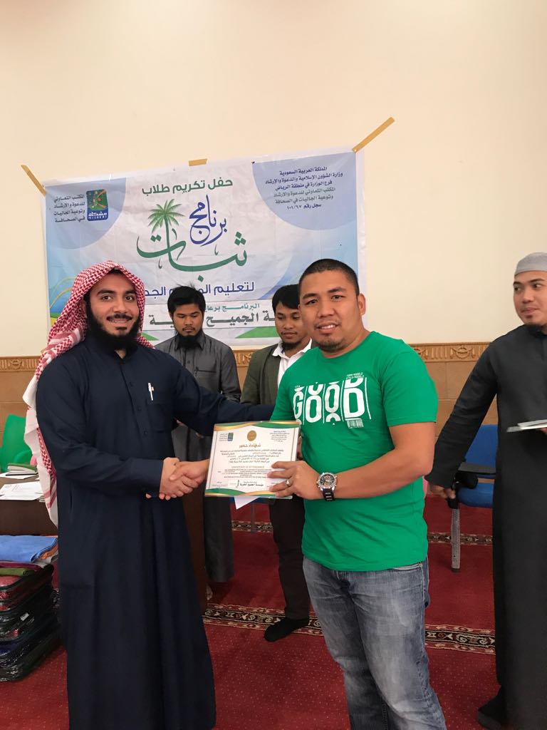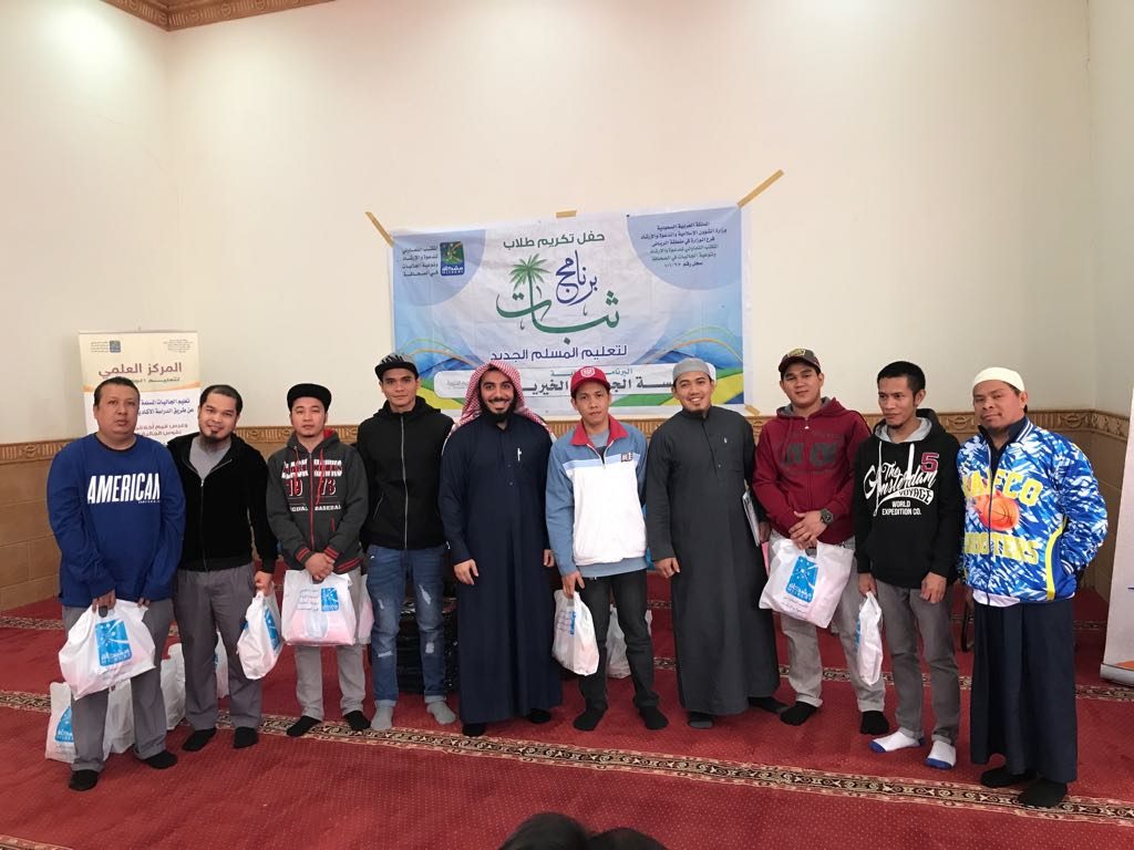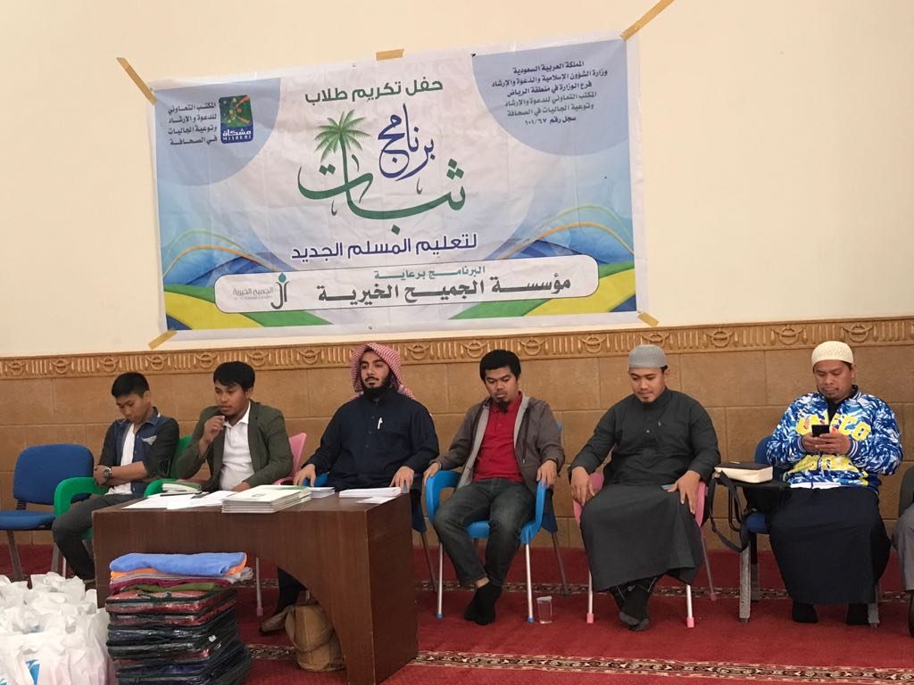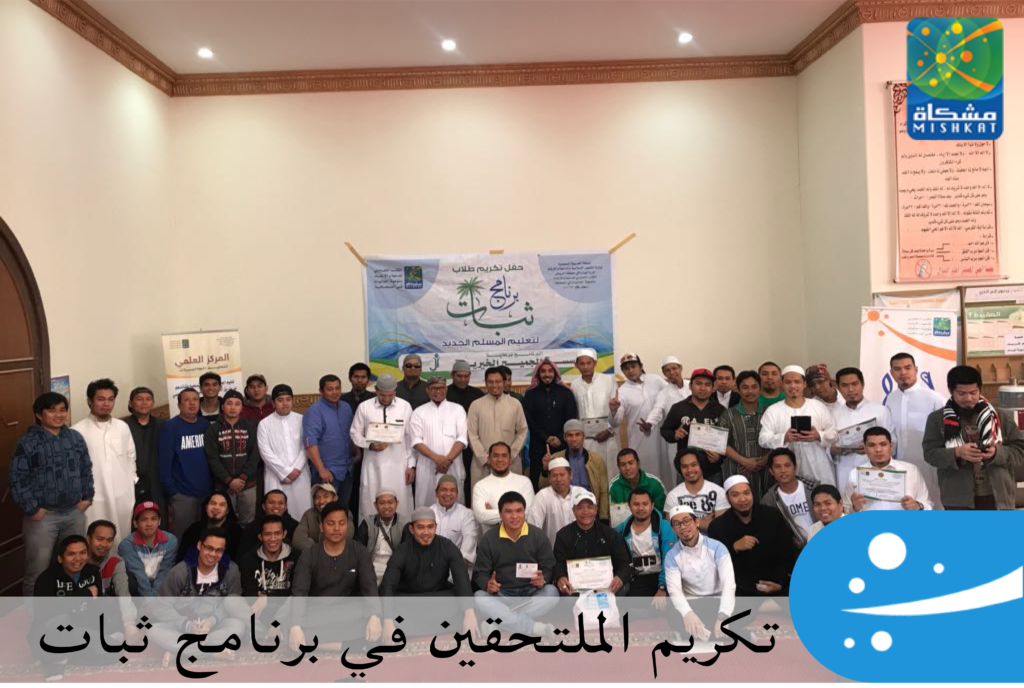 أقيم في يوم الجمعة الماضي ١٤٣٩/٥/٢ الحفل التكريمي لبرنامج ( ثبات ) لتعليم المسلم الجديد , وقد بلغ عدد الأشخاص الملتحقين بالبرنامج ٦٥ شخصًا ولله الحمد ، أسلموا على يد دعاة المكتب والتحقوا بالبرنامج لتثبيت إسلامهم وتعليمهم أمور دينهم , وحضر الحفل عدد من المسلمين الجدد مؤخرًا تمهيدًا لالتحاقهم بالبرنامج في فصله القادم .