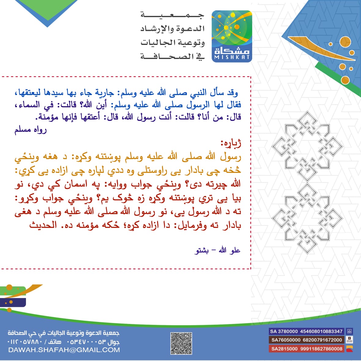 الدعوة إلى الله ( بشتو ) admin مارس 30, 2020 أخبار المكتب اضف تعليق 13 زيارة مقالات مشابهة تدشين الموقع الجديد للجمعية يوليو 15, 2021 الملتقيات الدعوية أغسطس 12, 2020 الجوالات الدعوية أغسطس 11, 2020 2020-03-30 admin شاركها Facebook Twitter Google + Stumbleupon LinkedIn Pinterest