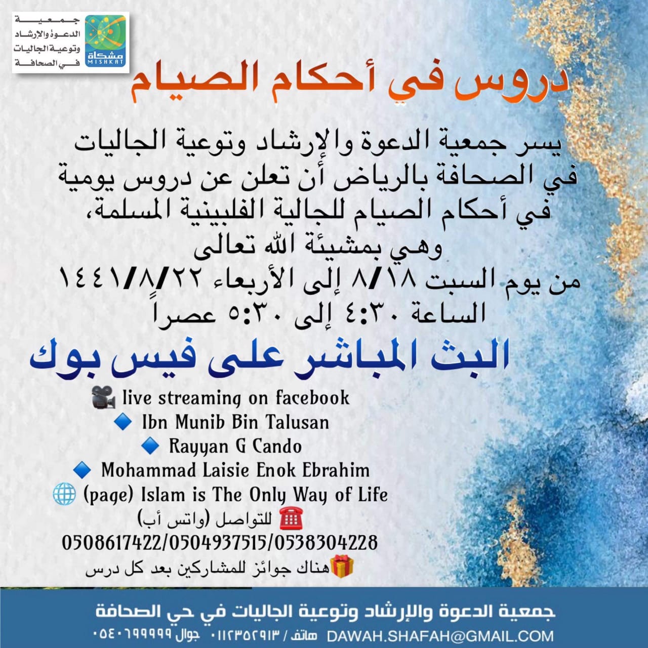 ▪️يسر جمعية الدعوة والإرشاد وتوعية الجاليات في الصحافة بالرياض أن تعلن عن دروس يومية عن أحكام الصيام للجالية الفلبينية المسلمة، وهي بمشيئة الله تعالى :