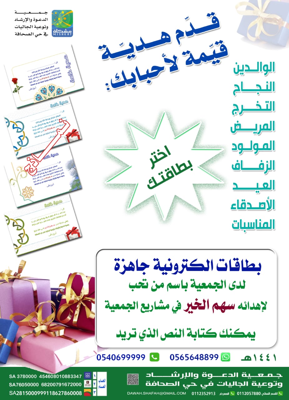 هديتك _ عندنا admin أبريل 16, 2020 أخبار المكتب, العلاقات العامة والاعلام, الموارد المالية, مكتبة الصور اضف تعليق 18 زيارة مقالات مشابهة تدشين الموقع الجديد للجمعية يوليو 15, 2021 الملتقيات الدعوية أغسطس 12, 2020 الجوالات الدعوية أغسطس 11, 2020 2020-04-16 admin شاركها Facebook Twitter Google + Stumbleupon LinkedIn Pinterest