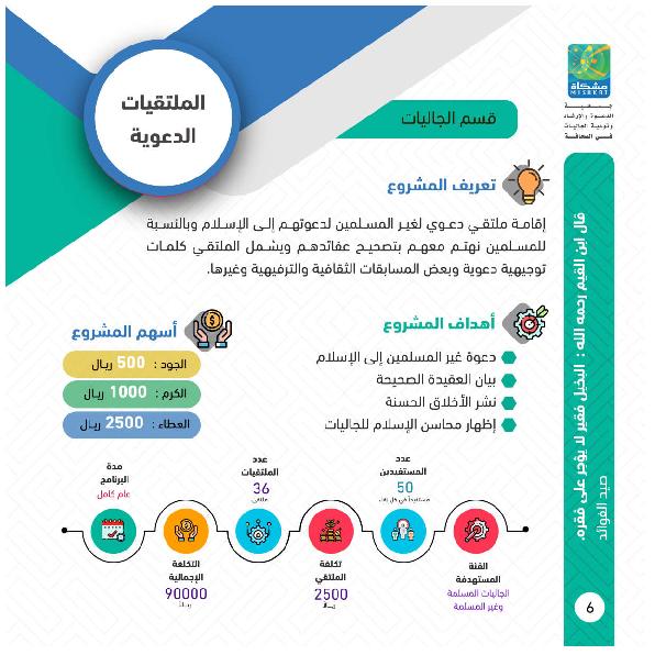 إقامة ملتقي دعوي لغير المسلمين لدعوتهم إلى الإسلام وبالنسبة للمسلمين نهتم معهم بتصحيح عقائدهم ويشمل الملتقي كلمات توجيهية دعوية وبعض المسابقات الثقافية والترفيهية وغيرها